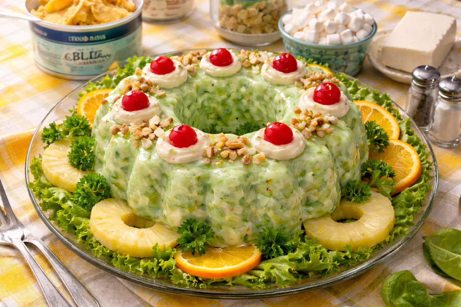 This might be the most visually baffling creation to come out of the mid-century kitchen. Picture this: a peeled banana stuck upright into a ring of canned pineapple. Then, to really sell the effect, a generous dollop of mayonnaise is drizzled down the side to look like melting wax. And at the very tip? A maraschino cherry, pinned in place to represent the flame. It was meant to be a fun, healthy treat for kids. The intention was sweet. The execution? Accidentally hilarious. No modern culinary school would ever let this near a kitchen. It’s a perfect time capsule of an era when presentation followed its own bizarre rules.